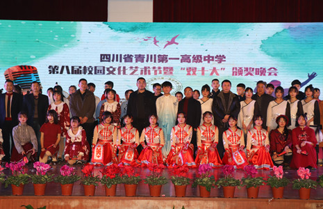 2020年1月3日晚,新年伊始,四川省青川第一高级中学(青川一中)第八届校园文化艺术节暨“双十大”颁奖晚会(学生最喜爱的十大老师、感动校园的十大学生)在学校报告厅隆重举行。青川一中党总支书记、校长邱正权与学校师生1300多人一起观看了晚会,并为获奖师生颁奖。广元电视台全程直播了颁奖晚会。