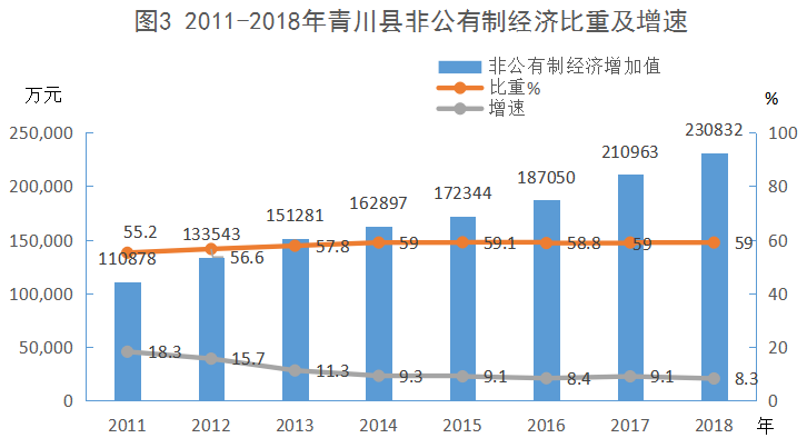 全县非公有制经济实现增加值230832万元,比上年增长8.3%,占GDP的比重为59%,对经济增长的贡献率为60.3%,拉动经济增长5个百分点。其中,民营经济实现增加值224600万元,比上年增长8.3%,占GDP的比重为57.4%,对经济增长的贡献率为58.2%,拉动经济增长4.8个百分点。非公有制经济分产业看,第一产业增加值19513万元, 比上年增长4.2%;第二产业增加值154426万元, 比上年增长9.6%;第三产业增加值56893万元, 比上年增长6.1%。年末工商登记个体私营企业 8851户,比上年增加948户。