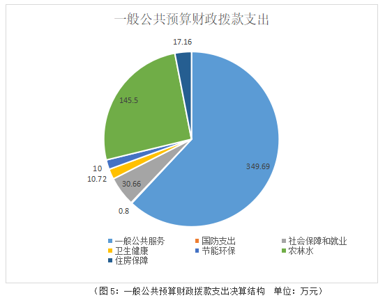 2019年一般公共预算财政拨款支出564.54万元,主要用于以下方面:一般公共服务支出349.69万元,占61.94%;国防支出0.8万元,占0.18%;社会保障和就业支出30.66万元,占5.43%;卫生健康支出10.72万元,占1.9%;节能环保支出10万元,占1.77%;农林水支出145.5万元,占25.77%;住房保障支出17.16万元,占3.03%。