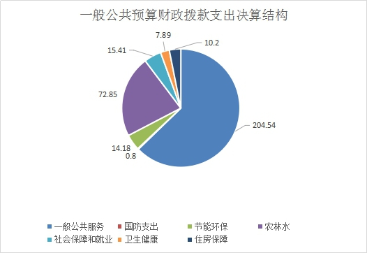 2019年一般公共预算财政拨款支出325.87万元,主要用于以下方面:一般公共服务(201类)支出204.54万元,占62.76%;国防支出(203类)0.8万元,占0.2%;节能环保(211类)支出14.18万元,占4.4%;农林水(213类)支出72.85万元,占22.35%;社会保障和就业(208类)支出15.41万元,占4.7%;卫生健康(210类)支出7.89万元,占2.4%;住房保障(211类)支出10.2万元,占3.1%。