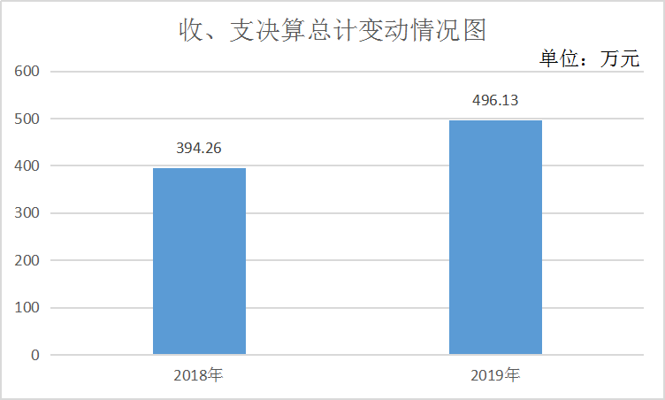 2019年度收、支总计496.13万元。与2018年相比,收、支总计各增加101.87万元,增长20.53%。主要变动原因是编制内实有人数增加,导致人员基本支出及日常事务公用支出收支增加。