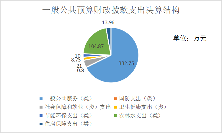 2019年一般公共预算财政拨款支出492.11万元,主要用于以下方面:一般公共服务(类)支出332.75万元,占67.62%;国防支出(类)0.80万元,占0.02%;社会保障和就业(类)支出21元,占4.27%;卫生健康支出(类)8.73万元,占1.77%;节能环保支出(类)10万元,占2.03%;农林水支出(类)104.87万元,占21.31%;住房保障支出(类)13.96万元,占2.84%。