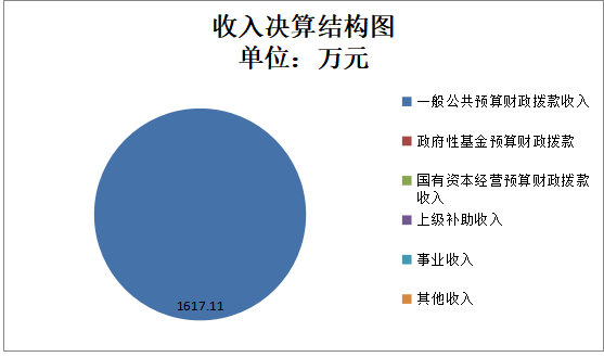2019年本年收入合计1617.11万元,其中:一般公共预算财政拨款收入1617.11万元,占100%;政府性基金预算财政拨款收入0万元,占0%;上级补助收入0万元,占0%;事业收入0万元,占0%;经营收入0万元,占0%;附属单位上缴收入0万元,占0%;其他收入0万元,占0%。