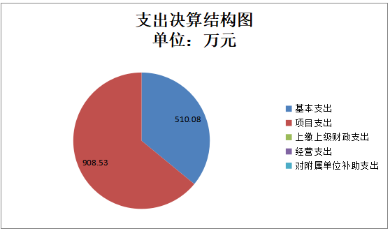2019年本年支出合计1418.60万元,其中:基本支出510.08万元,占36%;项目支出908.53万元,占64%;上缴上级支出0万元,占0%;经营支出0万元,占0%;对附属单位补助支出0万元,占0%。