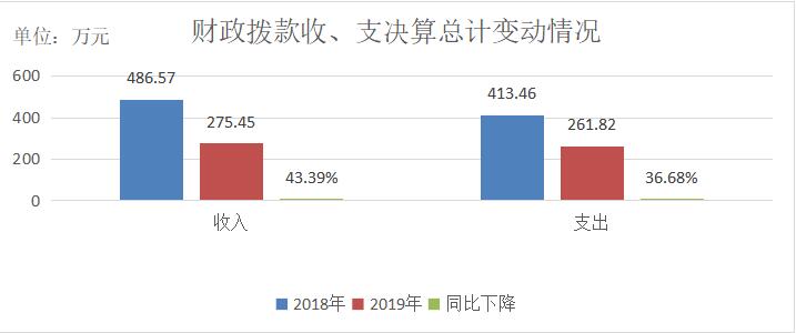 2019年财政拨款收入总计275.45万元、支出261.82万元,结余13.63万元。与2018年相比,财政拨款收入减少211.12万元,支出减少151.64万元,分别下降43.39%、36.68%,主要变动原因是冲减往年指标。