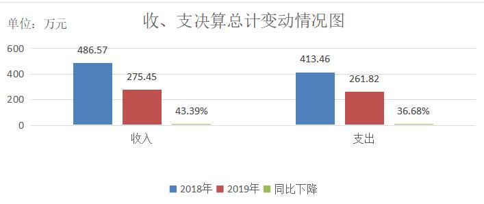 2019年度收入总计275.45万元、支出261.82万元,结余13.63万元。与2018年相比,收入减少211.12万元,支出减少151.64万元,分别下降43.39%、36.68%,主要变动原因是冲减往年指标。