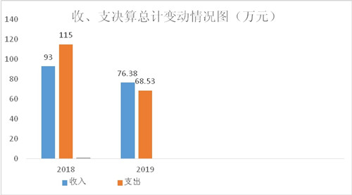 2019年初年结转和结余0.87万元,2019年度收入总计76.38万元,支出总计68.53万元。2018年度收入总计93万元,支出总计115万元。与2018年相比,收入总计减少16.62万元、支出减少46.47万元,收入下降17.87%,支出下降40.4%。主要变动原因:项目支出减少。