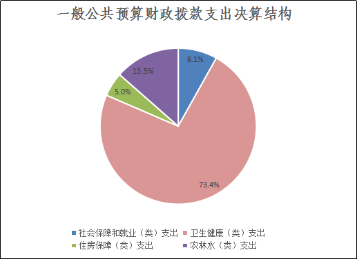2019年一般公共预算财政拨款支出491.8万元,主要用于以下方面:社会保障和就业(类208)支出39.77万元,占8.1%;卫生健康(类210)支出361.19万元,占73.4%;住房保障(类221)支出24.5万元,占5%;农林水(类213)支出66.34万元,占13.5%。