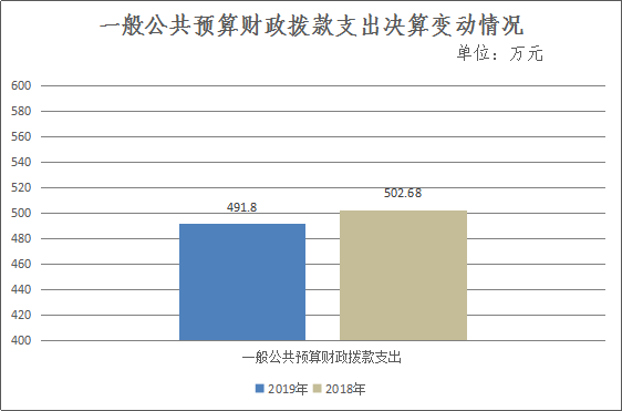 2019年一般公共预算财政拨款支出491.8万元,占本年支出合计的48.5%。与2018年支出502.68万元相比,一般公共预算财政拨款支出减少10.88万元,下降2.2%。