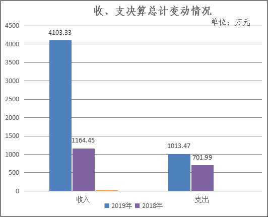 2019年度总收入4103.33万元(含年初结转和结余),与2018年度总收入1164.45万元相比增加2938.88万元,增长252%,主要原因是住院综合楼建设项目支出预算增加。2019年支出1013.47万元,与2018年支出701.99万元相比增加311.48万元,增长44%,主要原因是增加了住院综合楼建设项目支出。