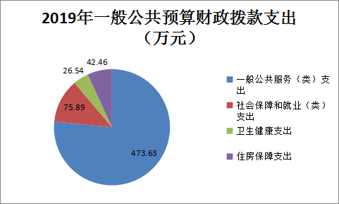 2019年一般公共预算财政拨款支出618.52万元,主要用于以下方面:一般公共服务(类)支出473.63万元,占77%;教育支出(类)**万元,占**%;科学技术(类)支出**万元,占**%;文化旅游体育与传媒(类)支出**万元,占**%;社会保障和就业(类)支出75.89万元,占12%;卫生健康支出26.54万元,占4%;住房保障支出42.46万元,占7%。