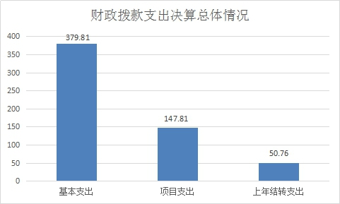 2019年本年支出合计578.38万元,其中:基本支出379.81万元,占65.67%;项目支出147.81万元,占25.56%;上年结转支出50.76万元,占8.77%;上缴上级支出0万元,占0%;经营支出0万元,占0%;对附属单位补助支出0万元,占0%。