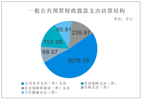 2019年一般公共预算财政拨款支出3636.53万元,主要用于以下方面:公共安全支出(类)支出3079.39万元,占84%;社会保障和就业支出(类)支出239.97万元,占7%;卫生健康支出(类)支出95.81万元,占3%;住房保障支出(类)153.29万元,占4%;其他支出(类)68.07万元,占2%。