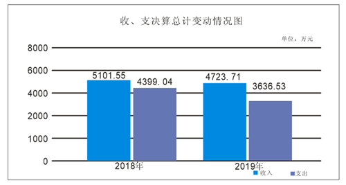 2019年度收入总计4723.71万元,支出3636.53万元,与2018年相比,收入减少377.84万元,下降7%。主要变动原因是办案业务经费减少。支出下降762.51万元,主要变动原因是项目资金减少。