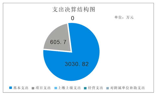 2019年本年支出合计3636.53万元,其中:基本支出3030.82万元,占83%;项目支出605.7万元,占17%;上缴上级支出0万元,占0%;经营支出0万元,占0%;对附属单位补助支出0万元,占0%。