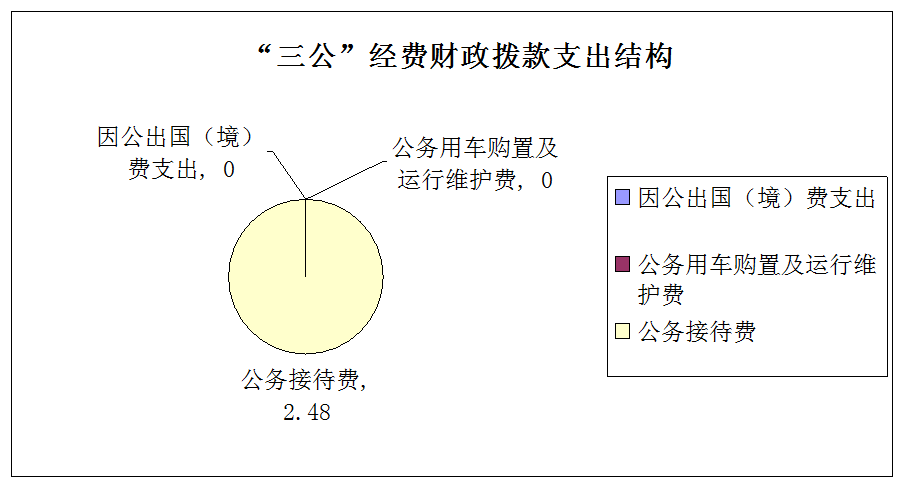 2019年“三公”经费财政拨款支出决算中,因公出国(境)费支出决算0万元,占0%;公务用车购置及运行维护费支出决算0万元,占0%;公务接待费支出决算2.48万元,占49.60%。具体情况如下: