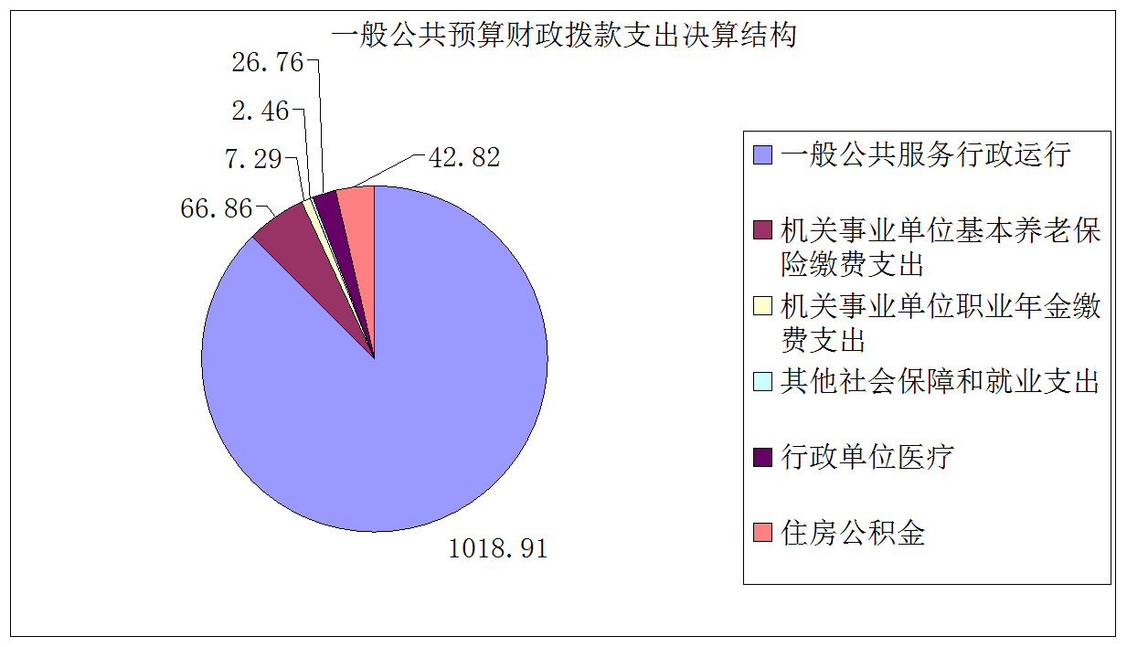 2019年一般公共预算财政拨款支出1165.11万元,主要用于以下方面:一般公共服务行政运行2010601支出1018.91万元,占87.45%;机关事业单位基本养老保险缴费支出2080505支出66.86万元,占5.74%,机关事业单位职业年金缴费支出2080506支出7.29万元,占0.63%,其他社会保障和就业支出2089901支出2.46万元,占0.21%,行政单位医疗2101101支出26.76万元,占2.29%;住房公积金2210201支出42.82万元,占3.68%。