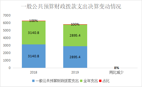 2019年一般公共预算财政拨款支出2895.4万元,占本年支出合计的100%。与2018年相比,一般公共预算财政拨款减少245.4万元,下降8%。主要变动原因是项目支出减少。