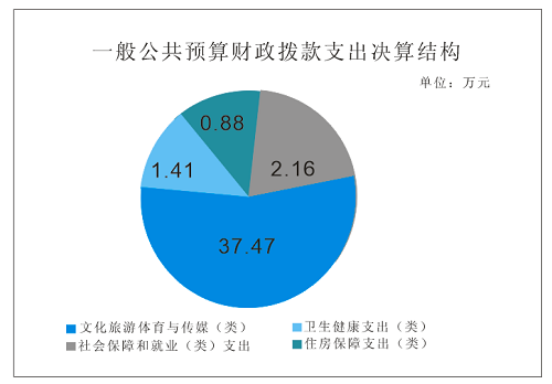 2019年一般公共预算财政拨款支出41.92万元,主要用于以下方面:一般公共服务(类)支出0万元,占0%;教育支出(类)0万元,占0%;科学技术(类)支出0万元,占0%;文化旅游体育与传媒(类)支出37.47万元,占90%;社会保障和就业(类)支出2.16万元,占5%;卫生健康支出0.88万元,占2%;住房保障支出1.41万元,占3%。
