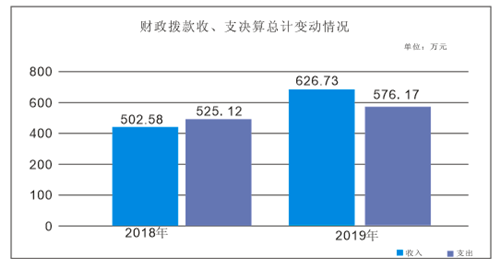 2019年财政拨款收入总计626.73万元,支出总计576.17万元。与2018年相比,收入总计增加124.15万元,增长25%,支出总计增加51.05万元,增长10%。主要变动原因是: 2018年社会保障和就业收入45.07万元,支出32.44万元, 2019年社会保障和就业收入31.81万元,支出31.81万元;2018年医疗卫生与计划生育收入11.83万元,支出11.83万元,2019年医疗卫生与计划生育收入13.34万元,支出13.34万元;2018年农林水收入461.91万元,支出461.9万元,2019年农林水收入509.68万元,支出509.68万元;2018年住房保障收入18.39万元,支出18.39万元,2019年住房保障收入21.34万元,支出21.34万元。