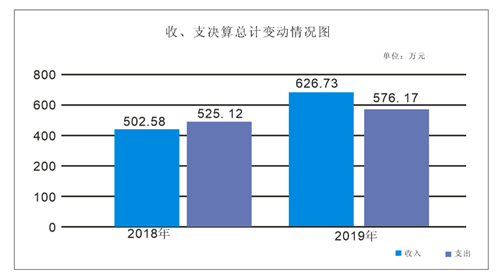 2019年度收入总计626.73万元,支出总计576.17万元。与2018年相比,收入总计增加124.15万元,增长25%,支出总计增加51.05万元,增长10%。主要变动原因:一是因警员职务套改,人员经费增加;二是日常公用经费增加。