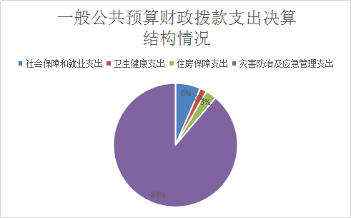 2019年一般公共预算财政拨款支出691.41万元,主要用于以下方面:社会保障和就业支出45.23万元,占6.54%;卫生健康支出12.34万元,占1.78%;住房保障支出19.74万元,占2.86%;灾害防治及应急管理支出614.10万元,占88.82%。