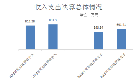总收支:2019年度年初结转和结余244.34万元,本年收入851.30万元,本年支出691.41万元,年末结转和结余404.23万元。
