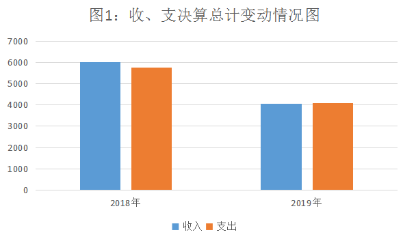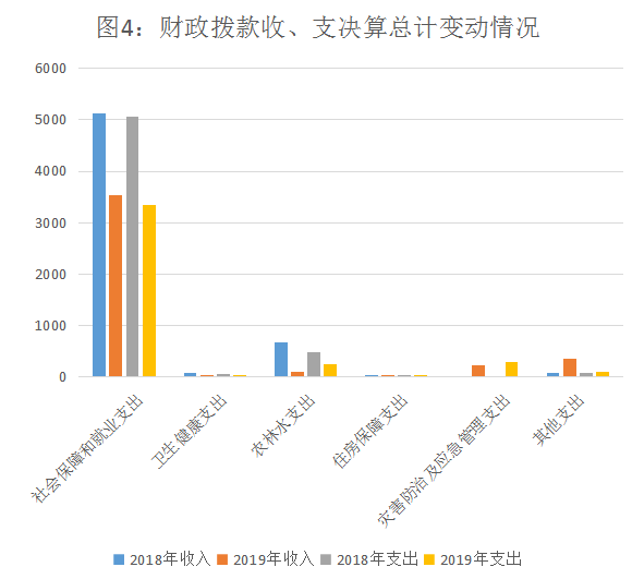 2019年财政拨款总计收4310.98万元、支4095.84万元。与2018年相比,总计收入减少1693.12万元,支出减少1652.98万元;总计收入下降28.20%,支出下降28.75%。主要变动原因:一是社会保障和就业支出2018年收入5123.28万元,2019年收入3527.50万元,减少1595.78万元;2018年支出5059.29万元,2019年支出3349.26万元,减少1710.03万元。二是医疗卫生与计划生育支出2018年收入76.83万元,2019年收入31.34万元,减少45.49万元;2018年支出63.2万元,2019年支出40.69万元,减少22.51万元。三是农林水支出2018年收入676.86万元,2019年收入100万元,减少576.86万元;2018年支出491.2万元,2019年支出258.00万元,减少233.2万元。