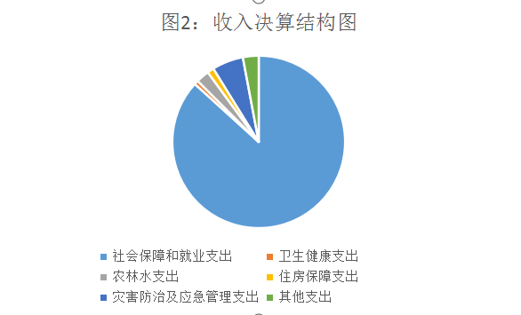 (一)收入情况。2019年收入4173.24万元。其中:社会保障和就业支出3527.50万元,占总收入的84.53%;医疗卫生与计划生育支出31.34万元,占总收入的0.75%;;农林水支出100.00万元,占总收入的2.4%;住房保障支出50.14万元,占总收入的1.2%;灾害防治及应急管理支出238.00万元,占总收入的5.7%;其他支出226.26万元,占总收入的5.42%。
