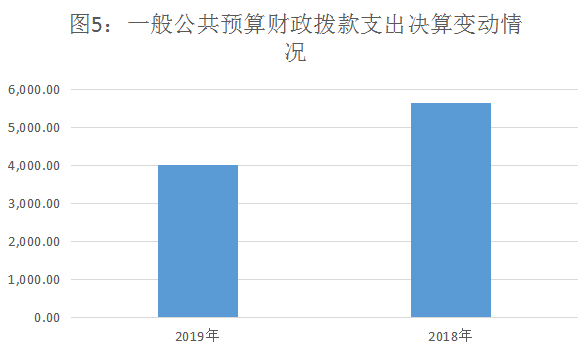 2019年一般公共预算财政拨款支出4027.90万元,占本年支出合计的98.34%。与2018年相比,一般公共预算财政拨款减少1632.93万元,下降28.85%。主要变动原因是机构改革职能划分将救灾、退役军人优抚安置、医疗救助等职能划转相关部门。