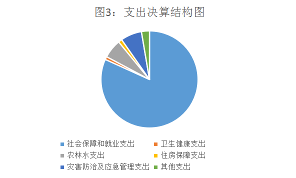 (二)支出情况。2019年决算支出4095.84万元。其中:社会保障和就业支出3349.26万元,占总支出的81.77%;医疗卫生与计划生育支出40.69万元,占总支出的0.99%;农林水支出258.00万元,占总支出的6.3%;住房保障支出50.14万元,占总支出的1.22%;灾害防治及应急管理支出288.68万元,占总支出的7.05%;其他支出109.07万元,占总支出的2.67%。