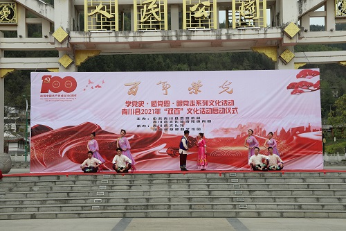 3月29日下午,由中共青川县委宣传部指导,青川县文化旅游和体育局主办,青川县文化馆、川北薅草锣鼓艺术团承办的“百年荣光”学党史 感党恩 跟党走系列文化活动暨青川县2021年“双百”文化活动启动仪式在青川县人民公园举行。