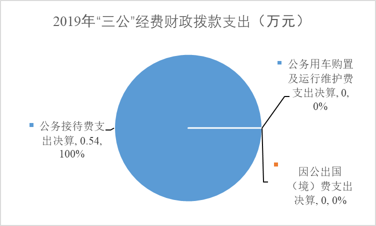 2019年“三公”经费财政拨款支出决算中,因公出国(境)费支出决算0万元,占0%;公务用车购置及运行维护费支出决算0万元,占0%;公务接待费支出决算0.54万元,占100%。具体情况如下: