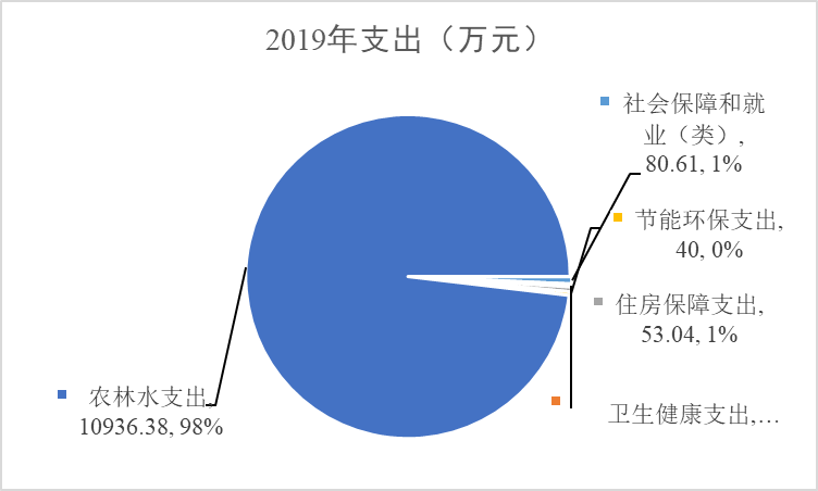 2019年一般公共预算财政拨款支出11143.17万元,社会保障和就业(类)支出80.61万元,占0.7%;卫生健康支出33.15万元,占0.3%;住房保障支出53.04万元,占0.5%;节能环保支出40万元,占0.4%;农林水支出10936.38万元,占98.1%。