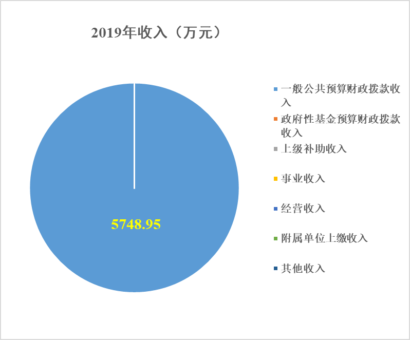 2019年本年收入合计5748.95万元,其中:一般公共预算财政拨款收入5748.95万元,占100%;政府性基金预算财政拨款收入0万元,占0%;上级补助收入0万元,占0%;事业收入0万元,占0%;经营收入0万元,占0%;附属单位上缴收入0万元,占0%;其他收入0万元,占0%。年初结转结余15551.56万元,总计21300.5万元。