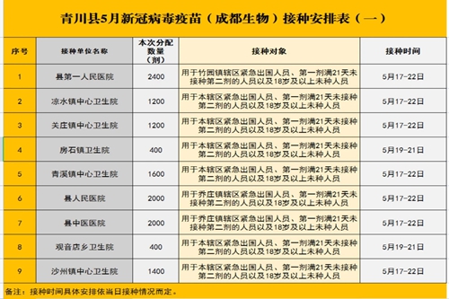 近日,我县将新到成都生物新冠病毒灭活疫苗12600剂,预计到苗时间为本周周日(5月16日)。按照四川省、广元市以及我县指挥部统一安排部署,决定于5月17日启动本批疫苗的接种工作,5月22日完成接种、疫苗清零,详细安排见下表。请市民朋友们及时关注“健康青川”微信公众号,了解我县新冠疫苗到苗情况及接种安排。