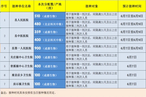 青川县2021年(第八批)新冠病毒疫苗分配表