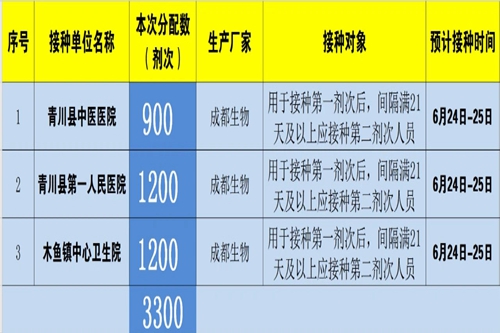 青川县2021年(第十六批)新冠病毒疫苗分配表