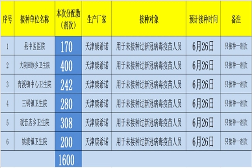 青川县2021年(第十八批)新冠病毒疫苗分配表