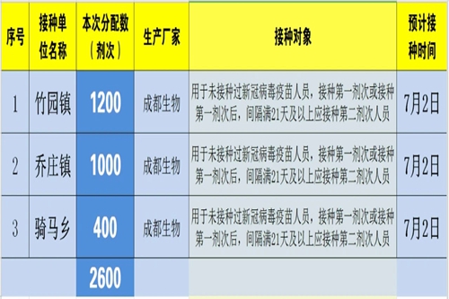 青川县2021年(第二十一批)新冠病毒疫苗分配表
