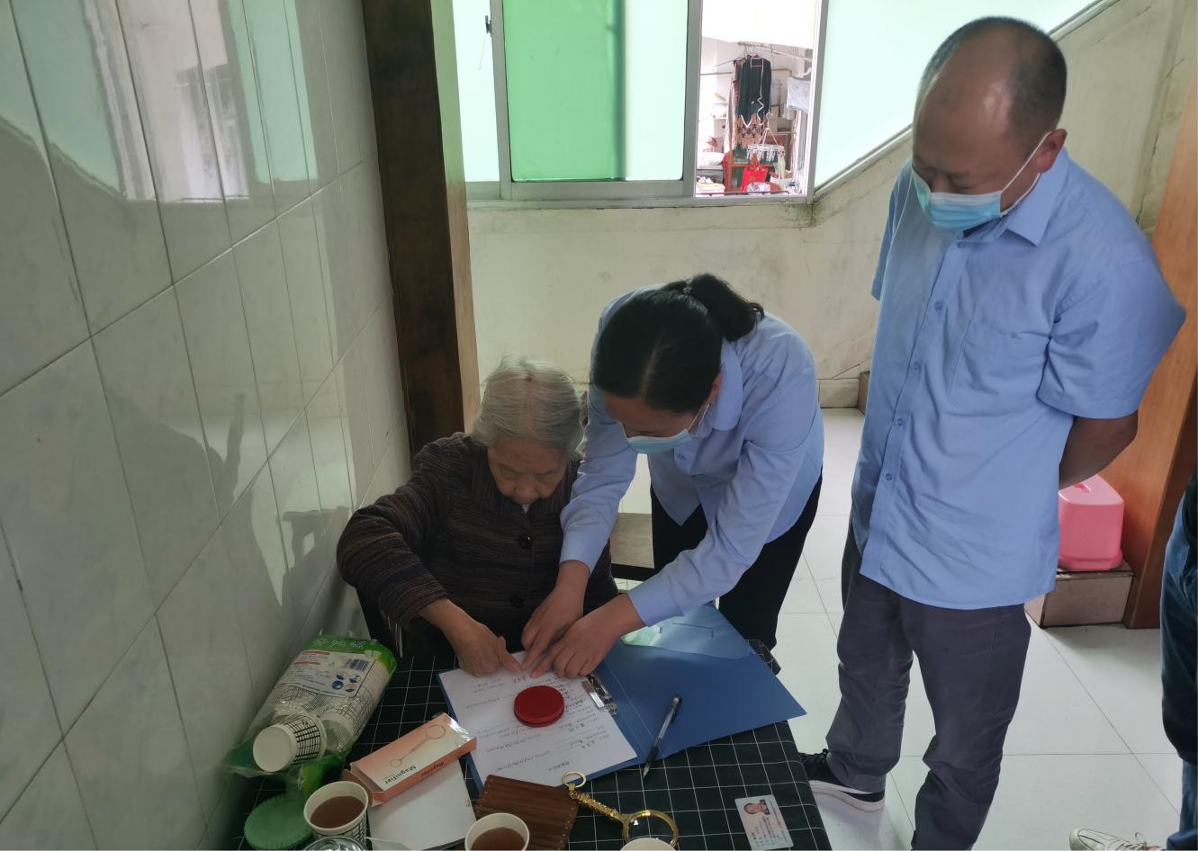 9月22日上午9时,青川县不动产登记中心接待了一名特殊的群众,袁某年事已高,视力模糊、腿脚不便、上下楼梯困难,无法亲自前往不动产登记中心进行办理房屋过户手续,不动产登记中心工作人员了解到该情况后,为其开辟了绿色通道,安排两名工作人员到其家中开展上门服务工作。工作人员在家中为老人进行身份核实,填写申请表、询问记录并签字确认。整个问询过程进行了录像,保证了业务办理过程的真实性、可靠性,用时2小时完成了全部房屋过户手续。