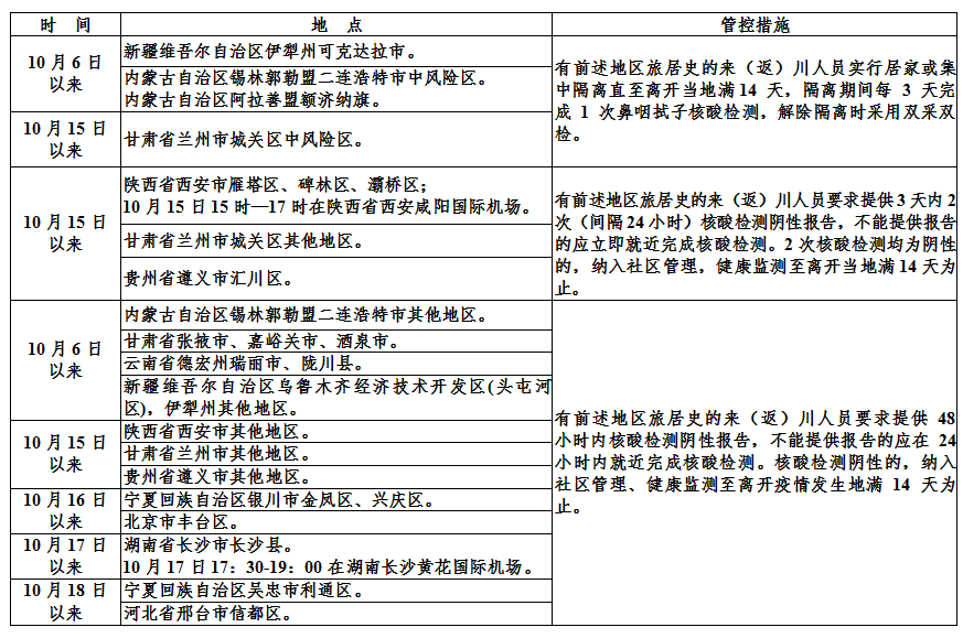 请有以上表格中相关地点旅居史的来(返)川人员,以及所有健康码“红码”和“黄码”人员,第一时间到所在村(社区)、工作单位或所住酒店报备,落实核酸检测并配合落实相关防控措施。