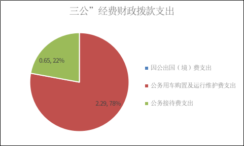 2020年“三公”经费财政拨款支出决算中,因公出国(境)费支出决算0万元,占0%;公务用车购置及运行维护费支出决算2.29万元,占77.89%;公务接待费支出决算0.65万元,占22%。具体情况如下: