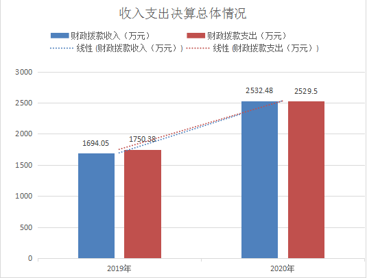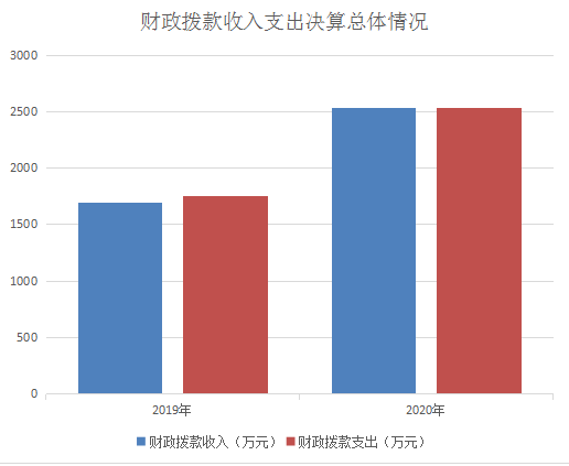 2020年财政拨款收入2532.48万元,支出总计2529.5万元。与2019年相比,财政拨款收入增加838.43万元,增长49%,财政拨款支出增加779.12万元,增长45%。主要变动原因:2020年农民工工资应急周转金850万元纳入2020年收入,相应产生的支出也增加了。
