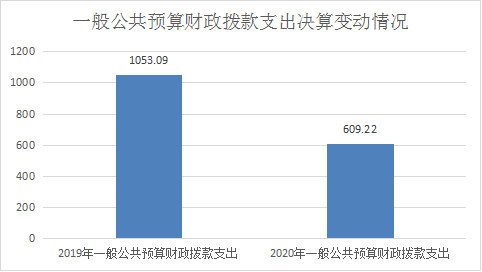 2020年一般公共预算财政拨款支出619.22万元,占本年支出合计的100%。与2019年相比,一般公共预算财政拨款减少433.87万元,下降41.2%。主要变动原因是更新公务用车降低了维修费及2020年四季度车辆维修费、12月驾驶员工资保险、差旅费结转到下年支付。