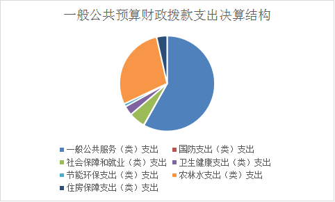2020年一般公共预算财政拨款支出585.78万元,主要用于以下方面:一般公共服务(类)支出340.54万元,占58.13%;国防支出(类)支出0.34万元,占0.06%;社会保障和就业(类)支出32.72元,占5.58%;卫生健康支出(类)支出18.66万元,占3.19%;节能环保支出(类)支出5.99万元,占1.02%;农林水支出(类)支出166.63万元,占28.45%;住房保障支出(类)支出20.9万元,占3.57%。