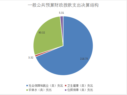 2020年一般公共预算财政拨款支出317.7万元,主要用于以下方面:社会保障和就业(类)支出218.75万元,占68.85%;卫生健康支出3.32万元,占1.02%;农林水支出90.32万元,占28.43%;住房保障支出5.31万元,占1.7%;
