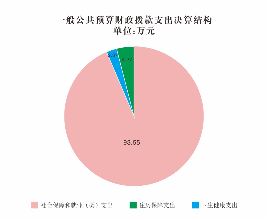 2020年一般公共预算财政拨款支出100.69万元,主要用于以下方面:社会保障和就业(类)支出93.55万元,占93%;卫生健康支出2.87万元,占3%;住房保障支出4.27万元,占4%。