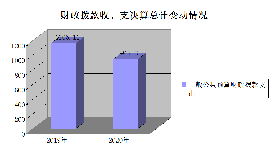 2020年一般公共预算财政拨款支出947.30万元,占本年支出合计的100%。与2019年相比,一般公共预算财政拨款支出减少217.81万元,下降18.69%。主要变动原因是:1、压缩开支,过紧日子。2、受疫情影响培训人次减少。3、受疫情影响接待人员减少。