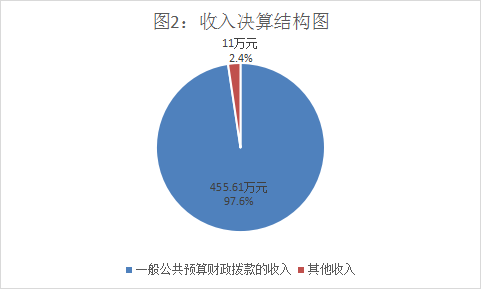 2020年本年收入合计466.61万元,其中:一般公共预算财政拨款收入455.61万元,占97.6%;其他收入11万元,占2.4%。